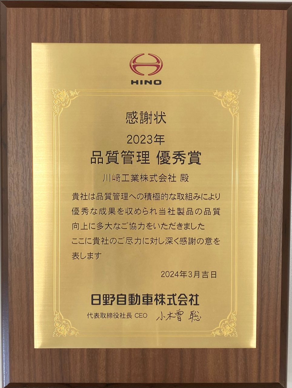 この度、日野自動車様より「品質管理 優秀賞」を受賞しました。これもひとえにお客様や関係者のご協力とご指導の賜物であり、心より感謝申し上げます。今回の受賞は日ごろの品質改善活動が実を結び、昨年度の納入不良件数0件、今年度もその状態が維持継続出来ていることをご評価頂き、受賞となりました。