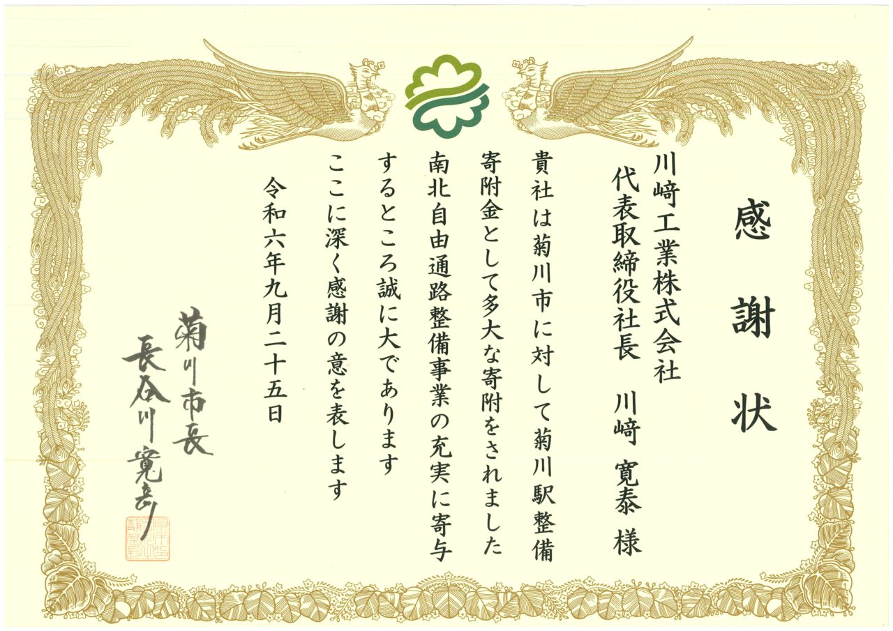 贈呈式では、弊社代表取締役社長 川﨑寛泰が出席し、市長長谷川寛彦様より感謝状を拝受いたしました。今後も地域社会との連携を深め、よりよい社会の実現に向けて積極的に取り組んでまいります。