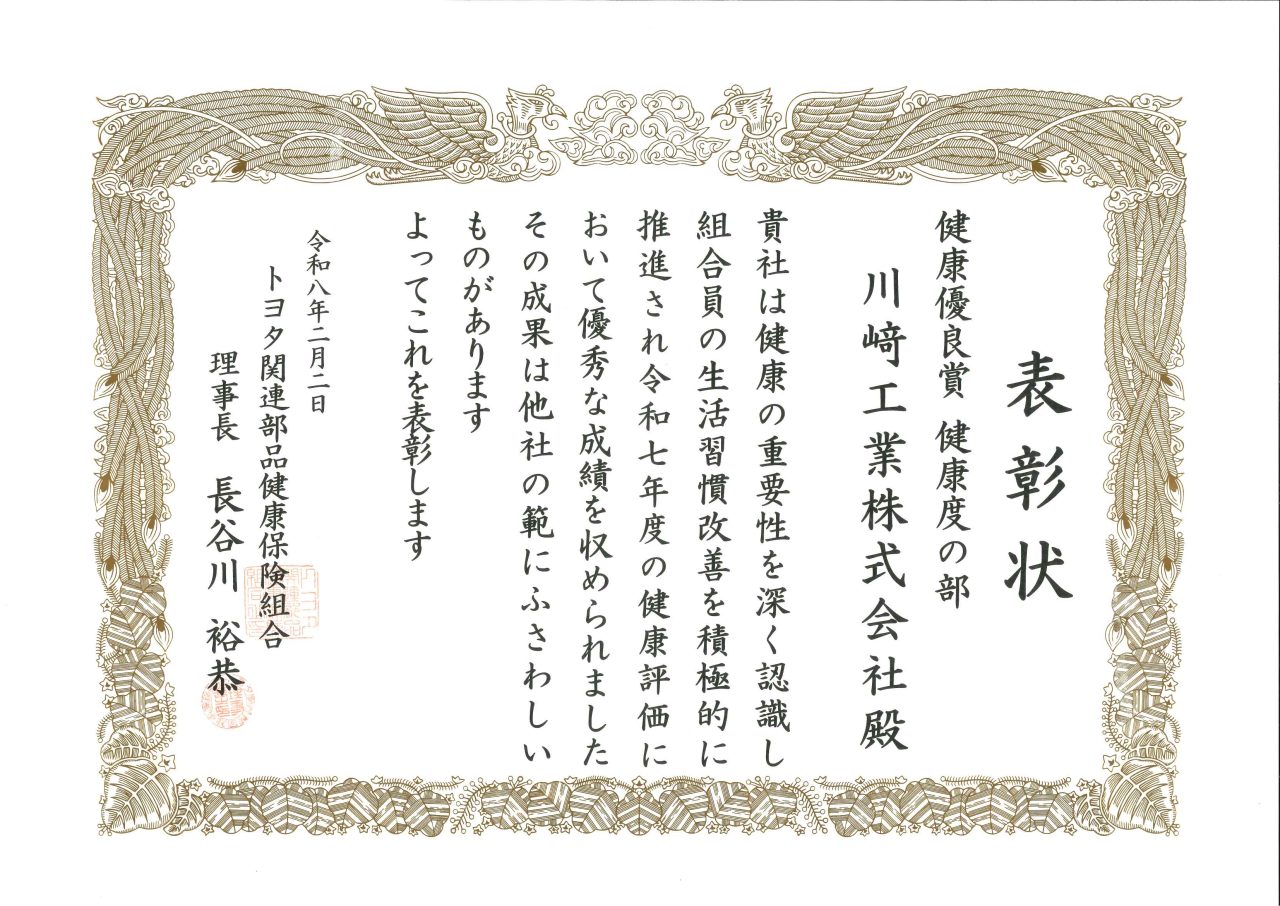 このたびトヨタ関連部品健康保険組合様より、健康優良賞 健康度の部 を受賞しました。今回の受賞で3年連続となります。